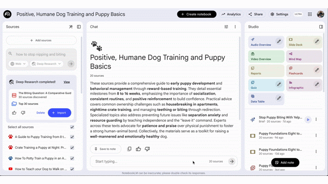De flashcards en quizzen zijn ook verbeterd. Voortgang wordt opgeslagen tussen sessies. Je markeert kaarten als "Got it" of "Missed it", shufflet het deck en herhaalt wat je nog moet leren. Verder ondersteunt NotebookLM nu EPUB als bronformaat. En chatgesprekken worden automatisch opgeslagen, zodat je later precies verder kunt waar je was.