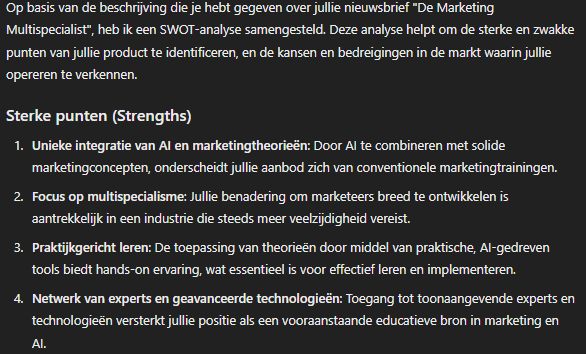 Laat ChatGPT de SWOT-analyse voor je uitwerken met de volgende prompt: